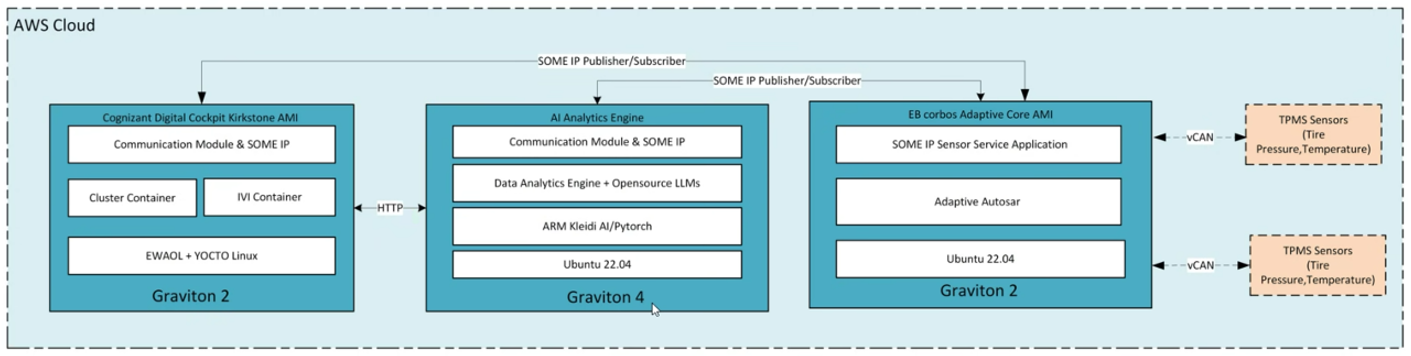 To maintain compatibility with legacy automotive systems, the Elektrobit-Cognizant TPMS architecture supports traditional signal-based communication protocols such as CAN (Controller Area Network) and LIN (Local Interconnect Network). These protocols are used to transmit raw sensor signals from the TPMS hardware to the edge gateway, where they are abstracted into service messages. EB corbos AdaptiveCore acts as a translation layer, converting these low-level signals into structured service payloads, enabling seamless integration with modern cloud-native components.