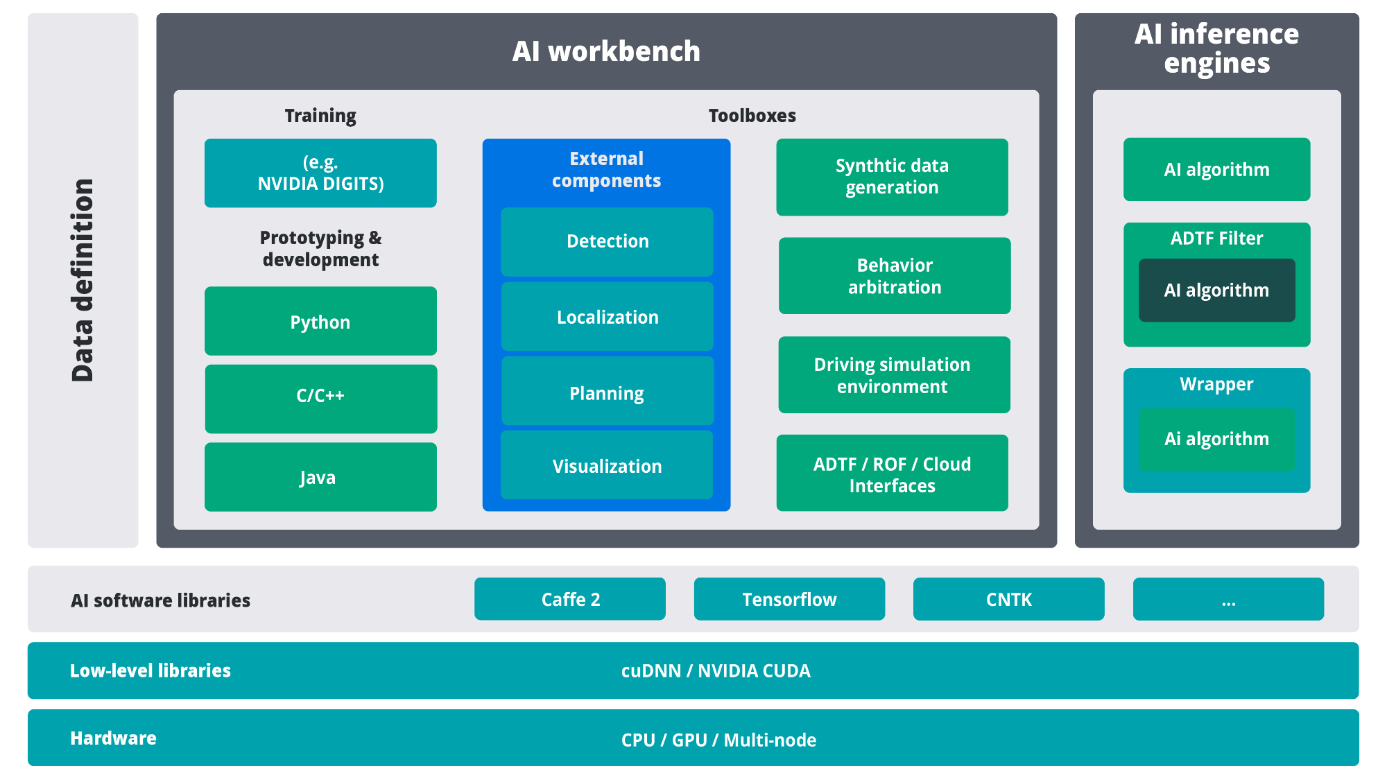 As a use case example, we are using the platform to build inference engines for ADTF. These engines are integrated within EB robinos, which include software modules for automated driving. Each filter encapsulates an AI algorithm, such as driving context understanding, synthetic data generation, object detection and recognition, or semantic segmentation of the driving scene.