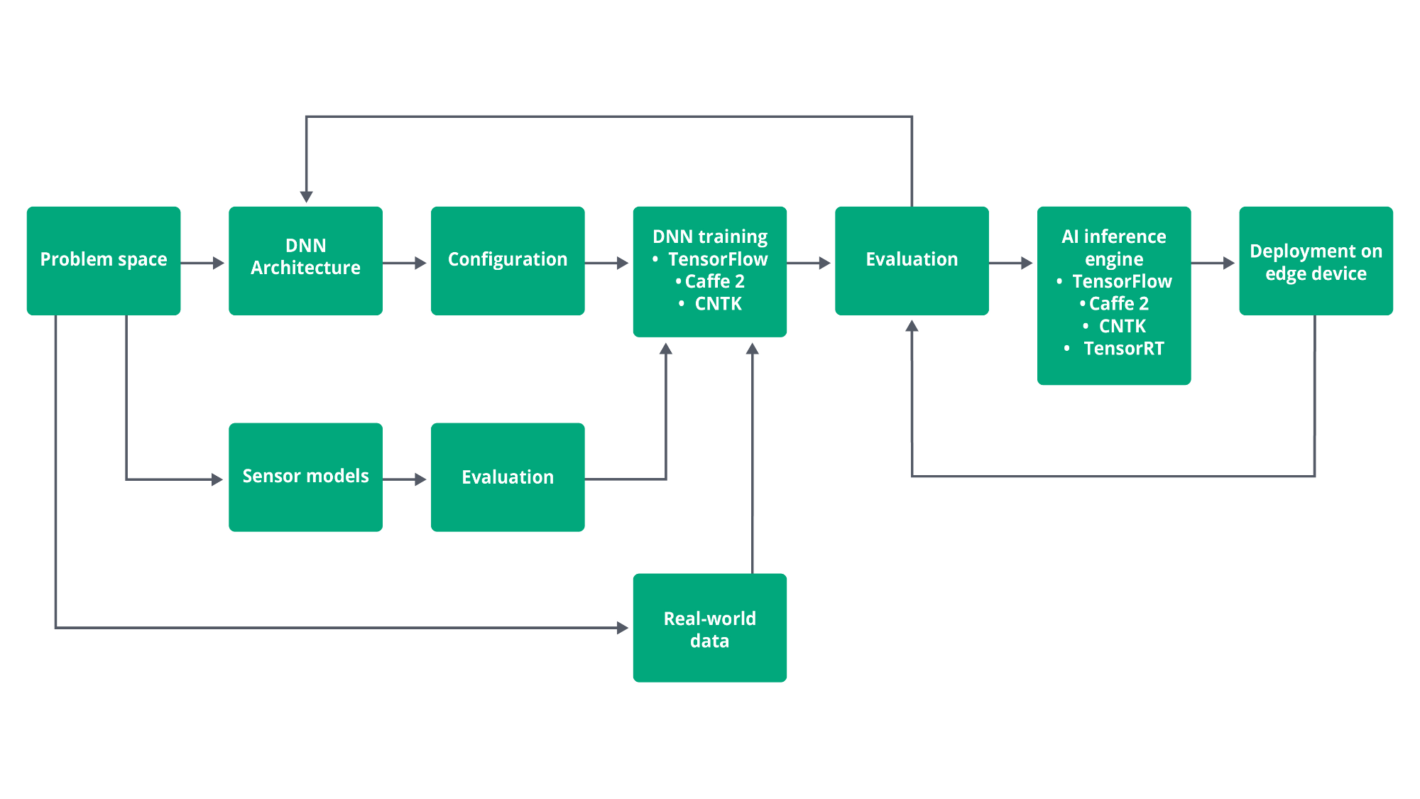 Developing AI algorithms in Elektrobit’s data science platform follows the workflow depicted in Figure 2. The first step consists of defining the requirements and collecting the necessary data for the training process. After the data is collected, it needs preprocessing, which includes annotation, normalization, and filtering. Data pre-processing is a key step which enables proper prototyping of the AI algorithms. A design phase is also necessary, followed by a training and validation process. Once the AI algorithm is tested and validated, it can be deployed as an AI inference engine.